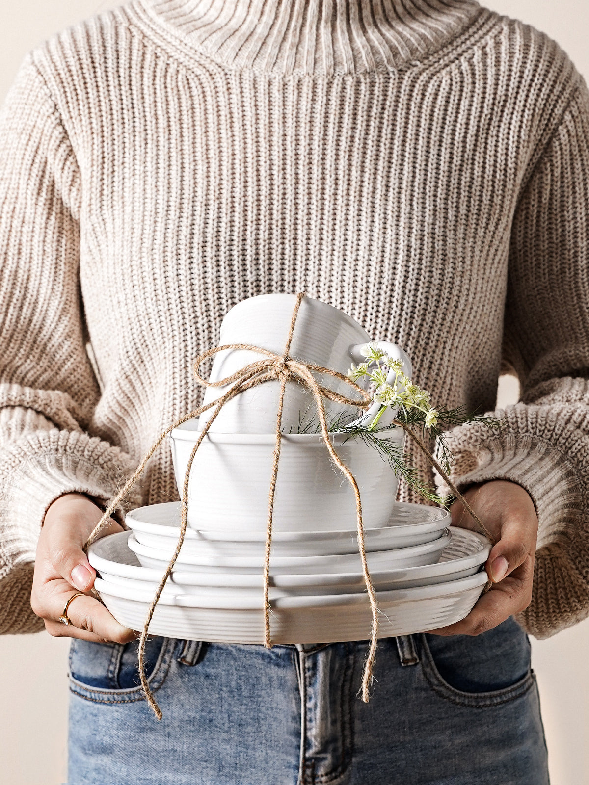 - Modern Farmhouse Look with Spiral Texture: Designed to blend rustic charm and modern simplicity, this dinnerware set features a subtle spiral pattern and soft white glaze that complements any kitchen décor—from farmhouse to minimalist. Adds warmth and style to everyday meals or holiday gatherings.