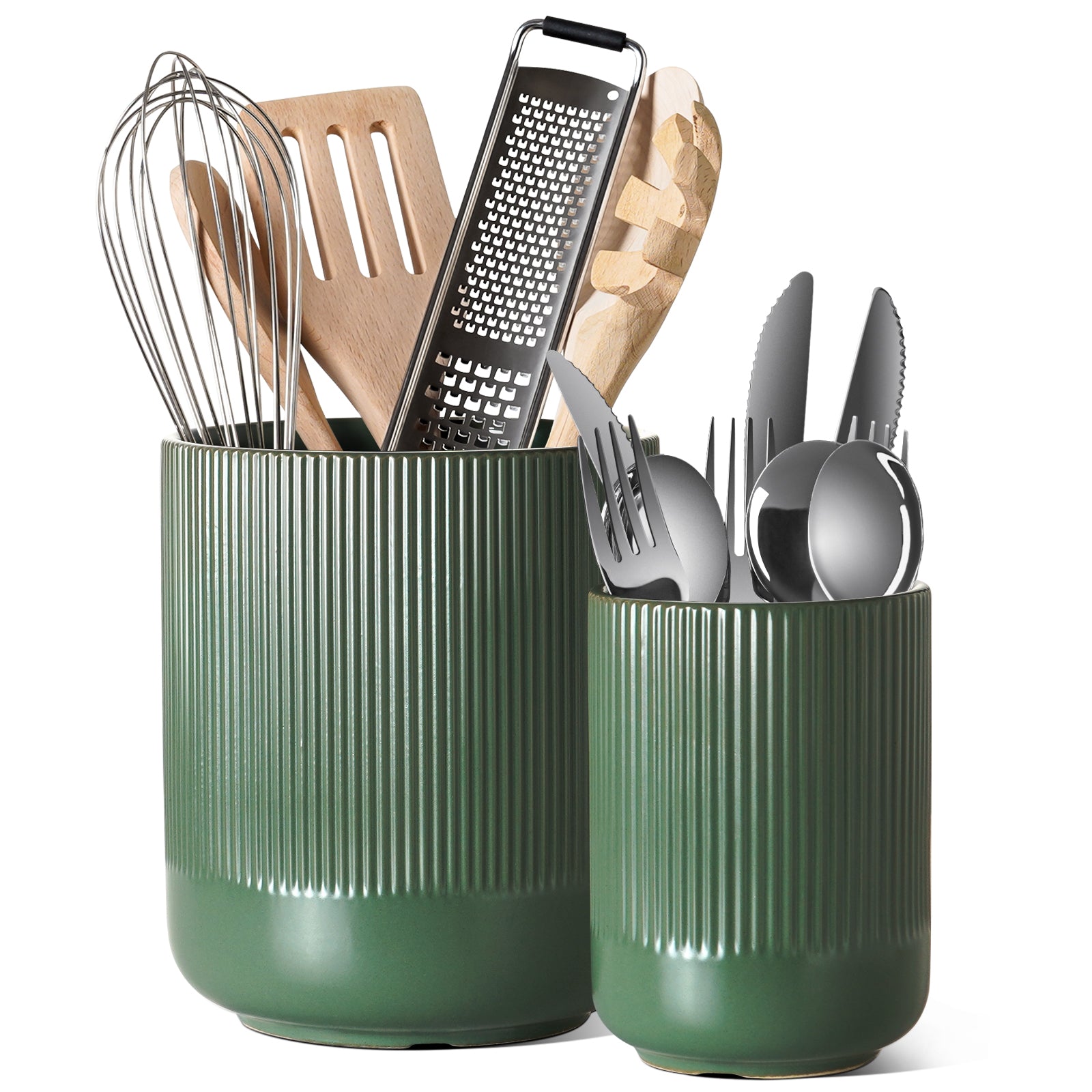 2-Pack Kitchen Utensil Holders, 7.3"+5.4" Ceramic Crocks for Kitchen, Cooking Organizer & Plant Pots, Forest Green Utensil Holder