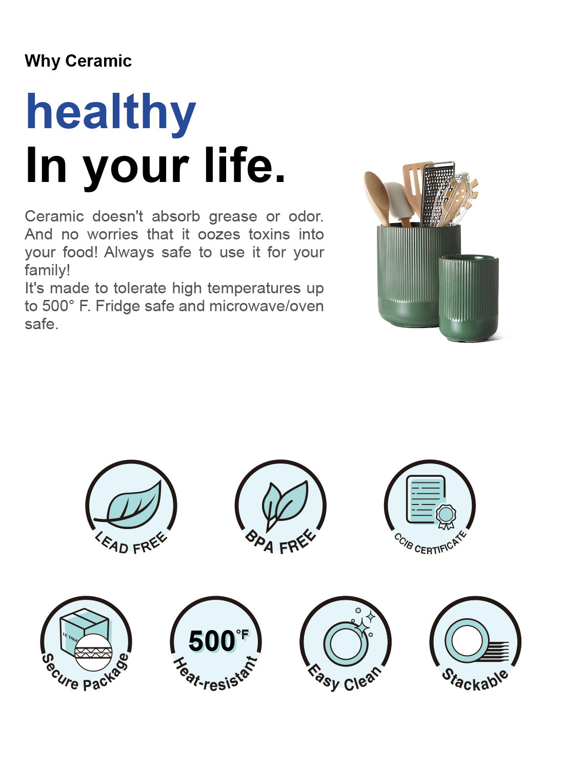 The LE TAUCI 7.3""+5.4"" Ceramic Utensil Holders, 2-Pack Kitchen Utensil Crock for Countertop & Kitchen Counter, Reactive Glaze Arctic White by BEMAY are perfect for organizing your kitchen. This set includes two ceramic holders: a larger one (H7.3"" x D6.2"") for about 15 utensils and a smaller one (H5.4"" x D4"") for up to 10 sets of flatware. These versatile holders can also be used as vases, storage for hair tools, or containers for coffee pods and stirrers. The chic, modern design with vertical raised stripes complements any kitchen decor, making them a great gift for cooking enthusiasts. Keep your utensils easily accessible and your kitchen tidy with these stylish and functional holders